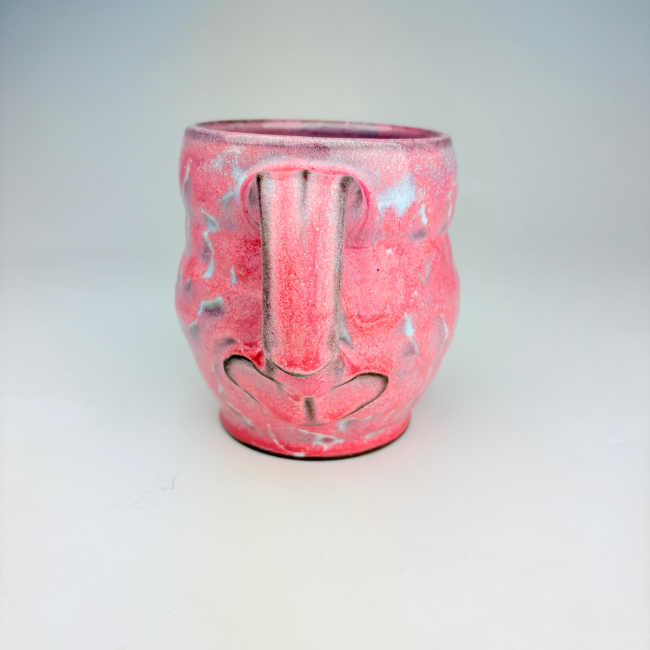 White and red glaze over a dark clay body. Generously sized to keep you in the coffee for a long time.